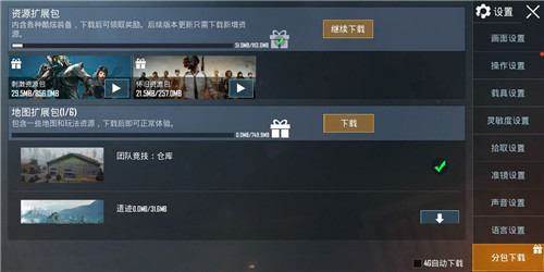 我们在游戏中的主界面中点击齿轮设置选项,并拉到最下方就可以看到分包下载的选项,测试服中的分为了资源扩展包和地图扩展包两种不同的数据包。我们如果全部下载的话,还可以领取一份小礼物。