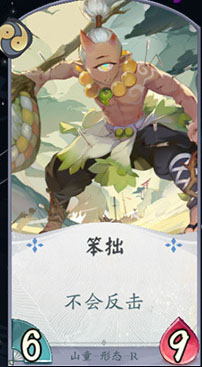 而弱点我们完全可以通过交替进攻的方式,使用其他前排式神的战斗牌或出击指令,将【笨拙】从战斗区换下,从而规避不会反击的弱点,9点血量在前中期被反伤的数值一般为2-3点,很难进入【凤火】的去除范围,也为下一轮次的交换及贯通输出做好准备。