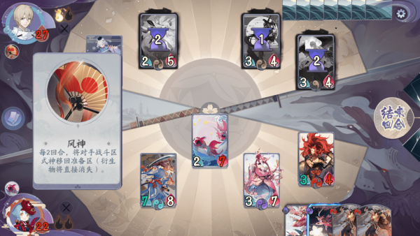 我方牌手的技能为金鱼•助阵,回合内使用2张或更多卡牌,回合结束时召唤金鱼,在本关我方被动技能被对方所克制,需要计算好大天狗被动技能生效的回合数,否则召唤出的金鱼会直接被击退离场。