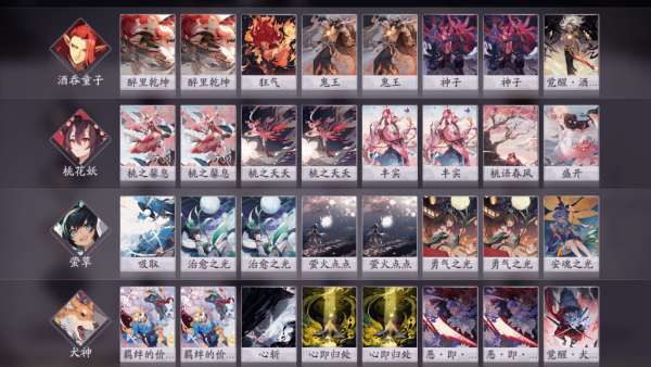 这次使用的是一套双核心卡组,以犬神和酒吞童子为输出核心,搭配萤草和桃花妖的辅助。在前期主要使用犬神吸收伤害,桃花妖给与恢复能力。对方为控制型卡组,需要提防雪女的2级形态牌“冰风暴”,以及总在后排释放法术的大天狗,所以携带两张“萤火点点”和一张“吸取”。