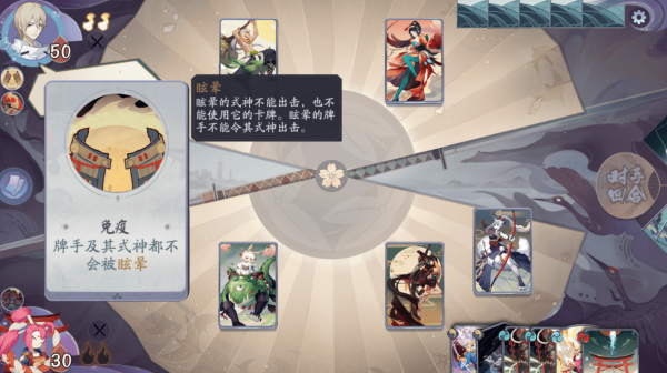 大天狗的被动技能是“免疫”和“风之庇佑”,免疫的效果是牌手及其式神都不会被眩晕。“免疫”的存在使得我们无法使用控制阵容去对阵大天狗,毕竟对手只有两位式神,要是全被控制,那不是任由我们宰割。