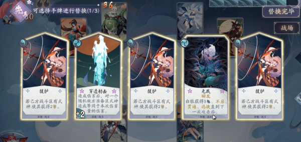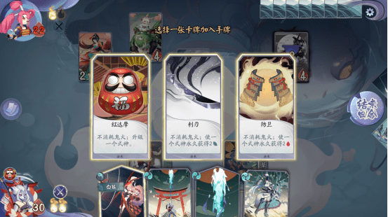 “红达摩”——不消耗“鬼火”升级一个式神;“利刃”——不消耗“鬼火”使一个式神永久获得+2力量;“防卫”——不消耗“鬼火”使一个式神永久获得+2生命。对局中我们要在不同的时机选择合适的卡牌来提升我们式神的战斗力。