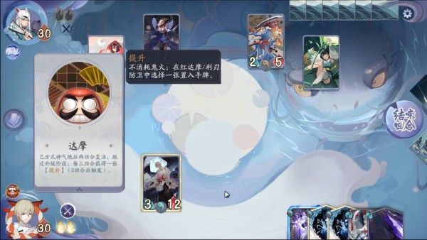 1.提升自己的式神等级后,优先利用“达摩”技能的衍生牌来增加自己的力量,我方式神有许多卡牌需要高力量才有强力的效果。