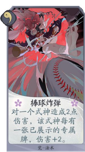 觉:棒球炸弹就是一个很好的收益单卡,本身只能对任意式神打2,在应对快攻的时候不算亏,但是如果不触发特效应对一些慢速卡组就比较吃亏了,但是随着我们观看敌方手牌的数量增加,可以让棒球炸弹伤害增加,灵视形态在对方使用展示牌时可以回复我方牌手生命,觉醒和心灵迷宫的联动会让敌人相当难受。