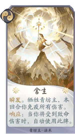 青坊主:青坊主的禅心形态拥有过牌能力,在法界唯心形态下,也可以输出AOE伤害,舍生牌还可以争取宝贵的一回合时间。多数情况下都是响应使用,保护牌手承受致命伤,可以说是青坊主保护能力的代表卡牌,让我们百分百争取到一个轮次。