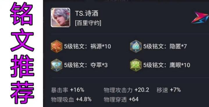 诗酒守约的铭文分别是10祸源、7隐匿、3夺萃、10鹰眼,属性加成为16%暴击率、20.2点物理攻击力、64点物理穿透、7%的移速以及4.8%的物理吸血。更加重视百里守约的物理穿透和暴击率属性,这也是打出高额伤害的关键因素。