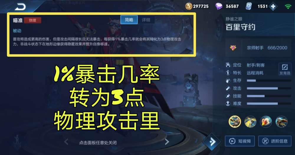 而分析百里守约的技能特点,就知道为何这么搭配了,守约的被动就是每获得1%暴击率就会将其转会为3点物理攻击力。