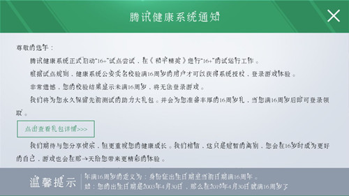 1)16周岁以下的未成年用户,通过强制性的公安实名校验,未满16周岁的用户将不能获得授权,无法登录游戏体验;和平精英也准备了丰富的助力大礼包,待用户年满16周岁,可以进入游戏领取