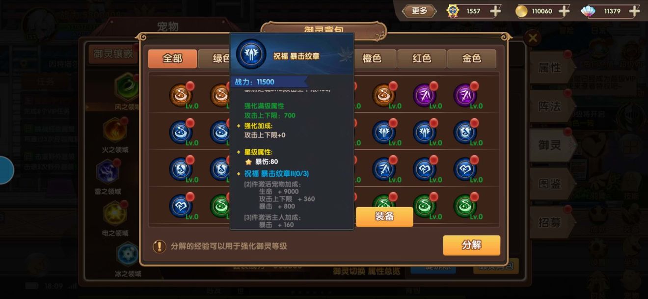 通过御灵宝库及魔宠战场,玩家们可以获得生命、攻击、防御、暴击、韧性等能提供不同属性加成的多种御灵,御灵共分为4钟品质,镶嵌同类型同品质的御灵即可激活套装属性,为玩家带来额外的属性加成。