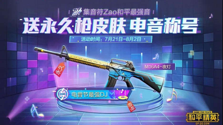 活动期间,特种兵通过完成每日活跃和社交互动任务,收集不同颜色的音符进行主题曲音乐片段合成,每完成1个片段可领取对应奖励,完成全部5个片段后可领取M16A4-夜灯(永久)和电音节最强DJ称号。