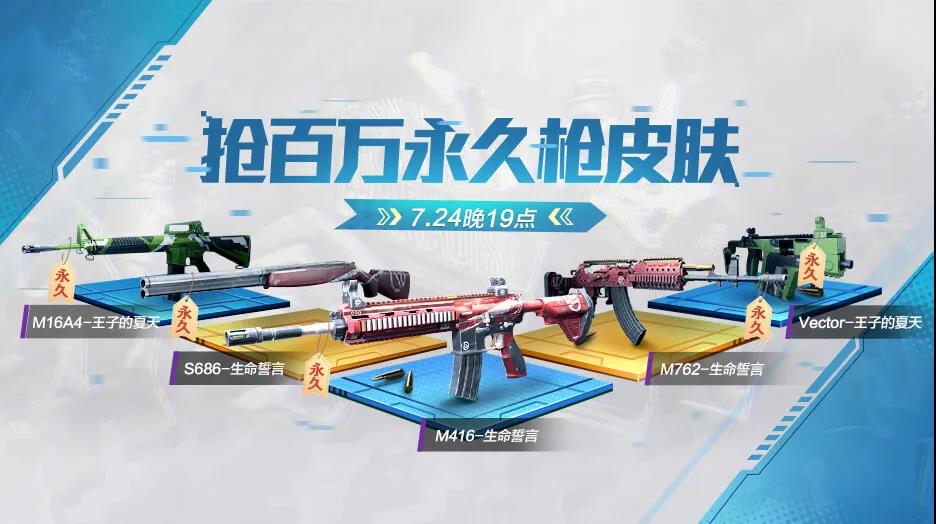 活动期间分享1次活动、7月24日19:00-20:59/21:00-23:00在线,可各开启1次宝箱,抽永久枪皮肤,开完这3个宝箱还可以打开1个大箱子,全部箱子开启必得永久或30天枪皮肤!