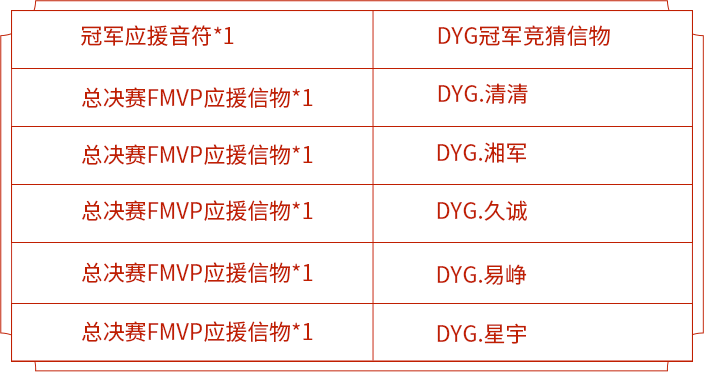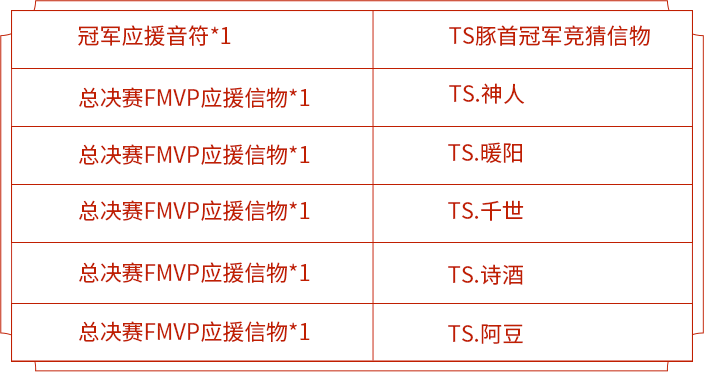 兑换活动:活动期间,冠军应援音符可兑换总决赛两支战队的信物,FMVP应援信物可兑换总决赛两支战队选手的信物,FMVP将只产生一名,召唤师们可以任意选择一名选手的信物进行兑换。