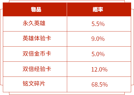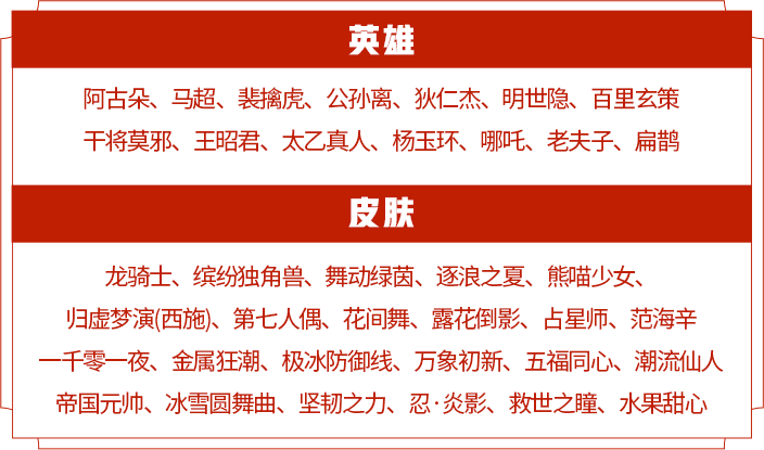 1、英雄秘宝:打开后可随机获得以下奖励之一,杨戬、沈梦溪、伽罗、英雄体验卡(3天)、双倍金币卡(1日)、双倍经验卡(1日)、188/138/108铭文碎片。