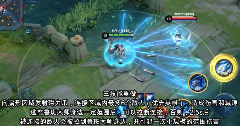 大招的重做是小编觉得最厉害的。鲁班大师向扇形区域发射磁力爪,连接区域内最多六个敌人(优先英雄),造成伤害和减速。如果逃离鲁班大师身边一定范围后,可以拉断连接。否则,2.5s后被连接的敌人会被拉到鲁班大师身边,并引起小规模的范围伤害。