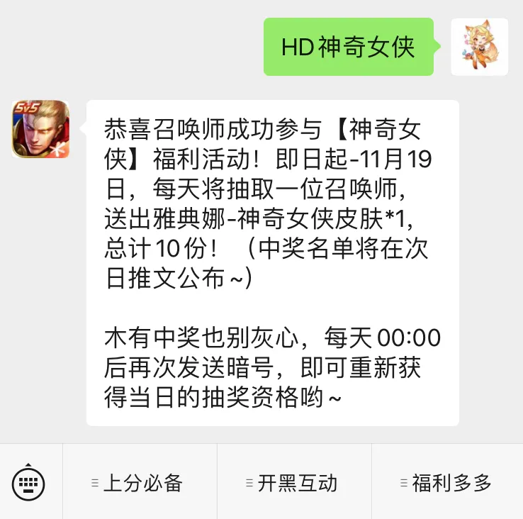 参与方式:在公众号后台发送HD神奇女侠,即可参与活动,每天抽取1位召唤师送出好礼,第二天推文开奖。据说多参与、多回复几次,能提高被妲己宝宝选中的几率哦~