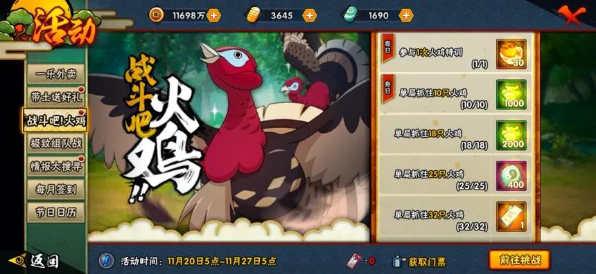 每天只有活跃箱子可以获得三张抓鸡门票;单局抓32只火鸡任务要完成;