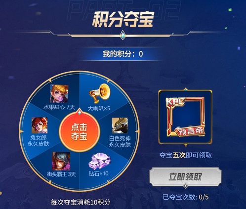 3、用户所获得积分后可进行夺宝,每次夺宝消耗10积分,当用户累计消耗50积分后即可领取专属头像框奖励;
