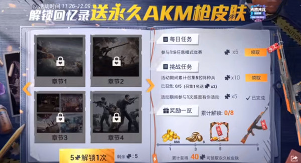 之后玩家可以通过完成活动任务来获取记忆碎片,从而解锁包括AKM灼热熔岩皮肤、烤鸡大餐头像框等奖励。