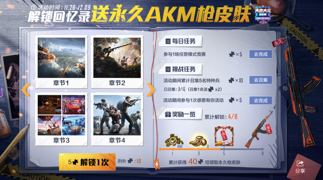累计获得40个记忆碎片解锁8个章节故事领取金币x888、服饰币x8、烤鸡大餐头像框、AKM-灼热熔岩(永久);