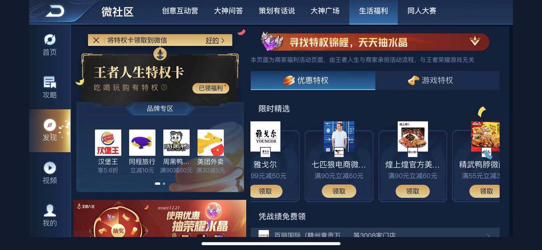 召唤师可以在《王者人生》小程序/App,王者荣耀微社区-发现-生活福利找到特权卡,享受超值优惠。各个优惠的使用路径,领取优惠后,请到我的福利-奖励说明具体查看。