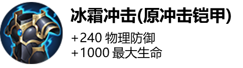 唯一主动-冲击:减少600范围内敌人15%移速和攻速,1.5秒后对400范围内敌人造成0.5秒晕眩,若目标移速或攻速受损(低于初始值),则分别追加0.25秒晕眩。冷却时间:90秒。