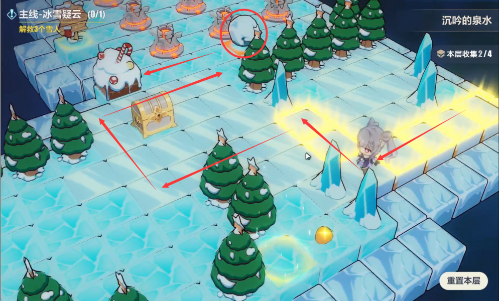 然后按照红色箭头的方向,我们就可以一次性把宝箱和雪人都互动到。