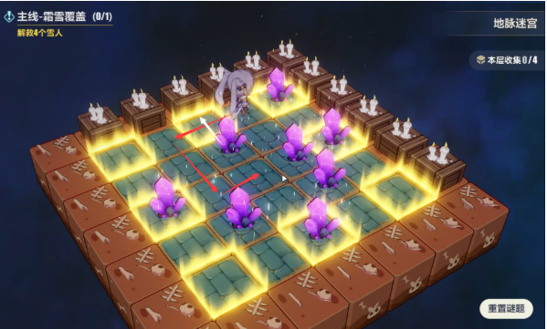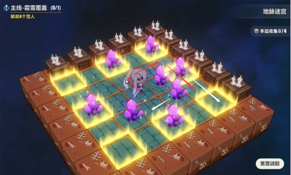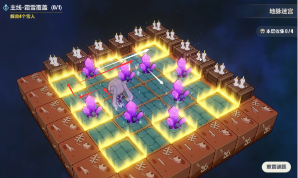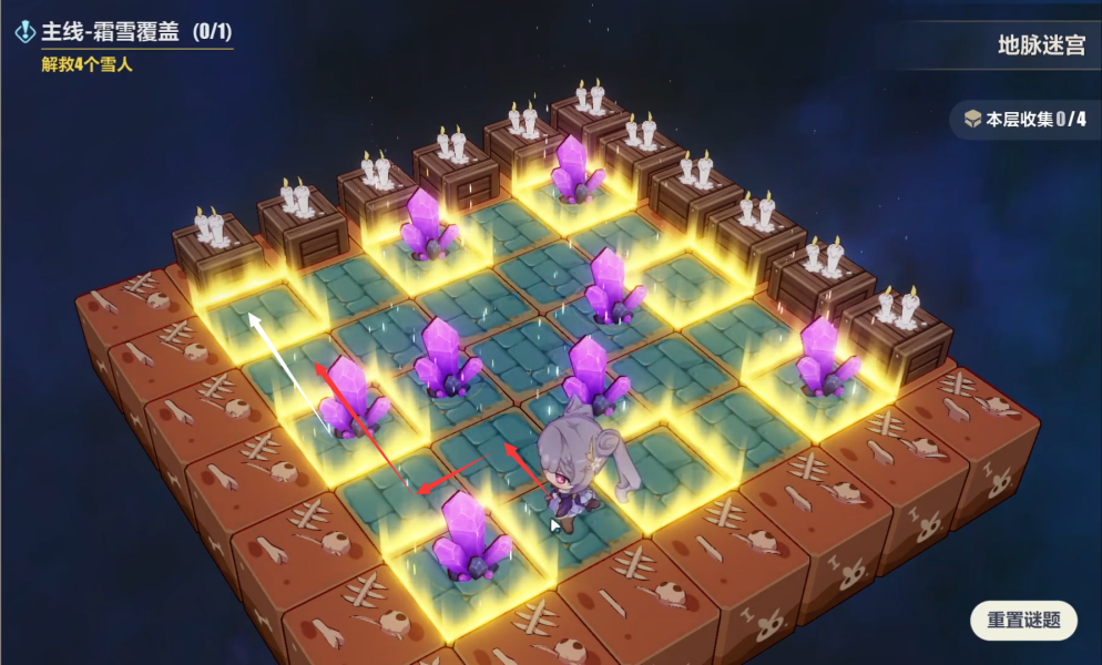 通过传送门来到这边,打小怪解救雪人这些都不难,我们直接进入雪人身后的地脉迷宫,我们一共七步就可以解开这个推箱子的谜题,这里要注意的是,下面我会用白色箭头标识晶体的移动路线,红色箭头标识人物的移动路线,各位注意跟着我的步骤走。
