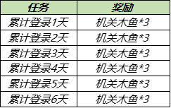 活动期间累计登录6日,总共可获得机关木鱼*18