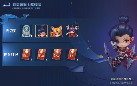 开启电竞喝彩礼包,有机会获得:随机金额现金红包(最高66.6元)、多种周边手办、随机数量电竞豆等;大奖详情请在每周福利-大奖模块查看。