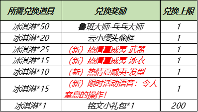 夏日福利乐享一夏!活动期间收集冰淇淋兑鲁班大师-乓乓大师(永久)、小乔-缤纷独角兽-热情夏威夷星元部件、云小缨头像框和全新限时活动语音:令人窒息的操作!等奖励!活动期间还将上架蔷薇之心和亲密道具等奖励,敬请期待!本期活动可通过“冰爽一夏”、“周末挑战”、等活动收集,还可通过特惠商城购买获得,最多可购买冰淇淋*10