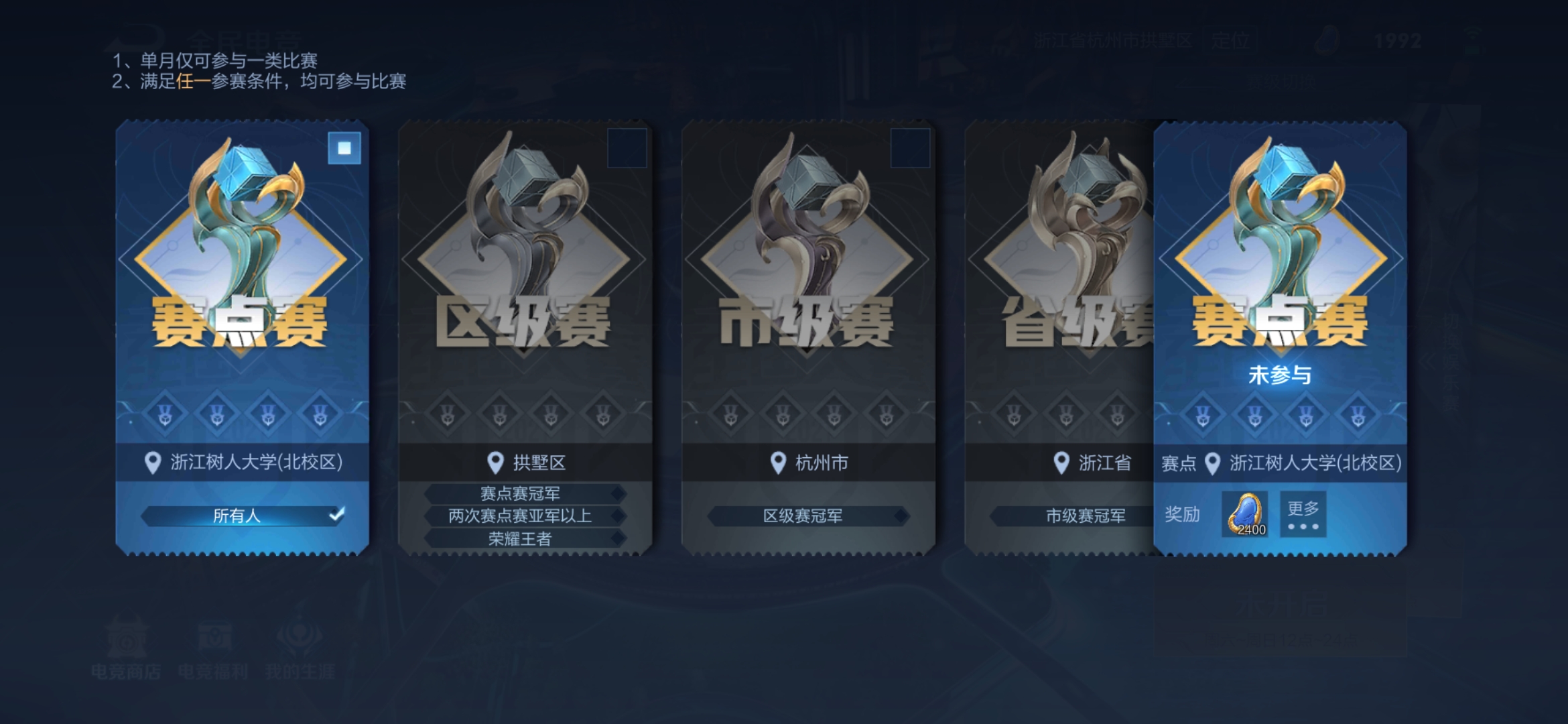 赛点赛的冠亚军以及荣耀王者可以参加区级赛,也就是更高一级的赛事。
