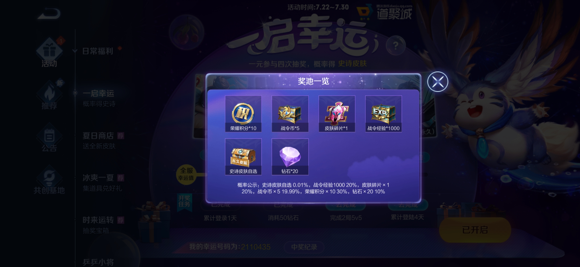 活动开启后,每个幸运号码均可在达到全服奖池开启进度和完成个人任务的情况下,开启四次奖池,奖池有概率开出永久史诗皮肤,奖池开启后,召唤师们记得来领取奖励;(活动概率公示详见活动面板)