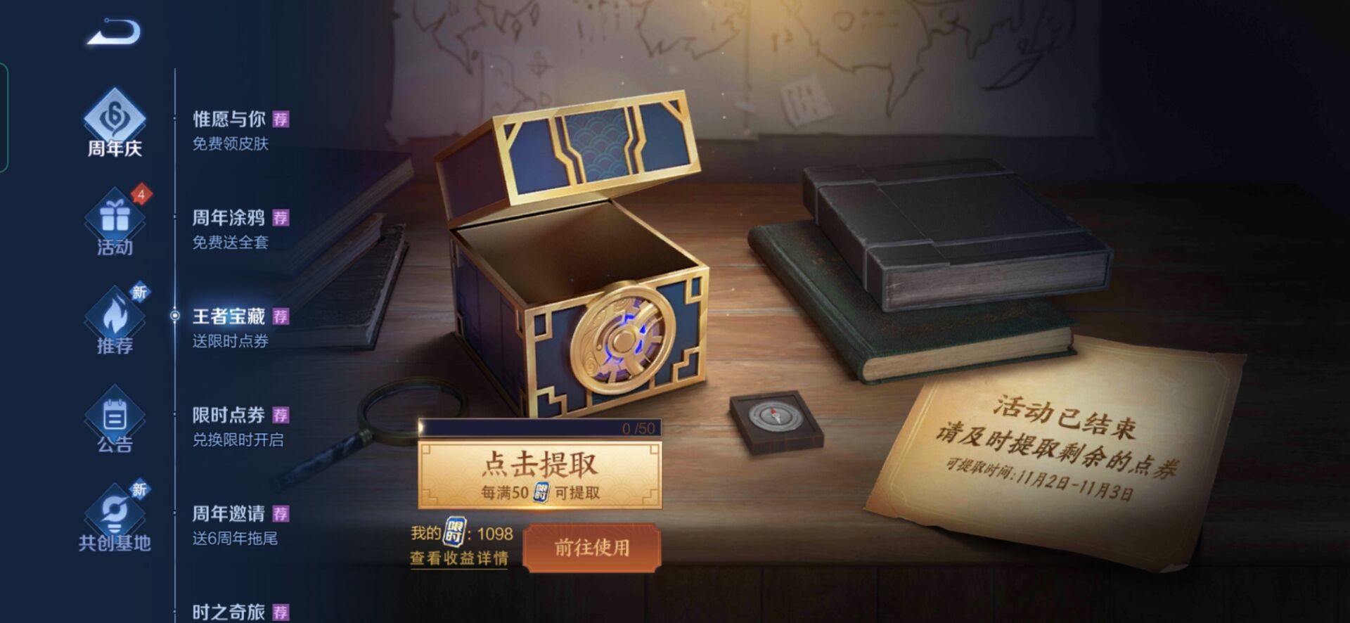 1、王者荣耀6周年庆的活动将在近期陆续开启,第二期有保底的500点券可以领取;