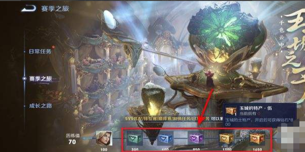 4、就可以在赛季之旅里面的看到历练值,只要满100就可以获得达摩的新皮肤沙漠行僧,后面是有五个玉城的特产是可以进行领取,只要达到对应的历练值即可领取。