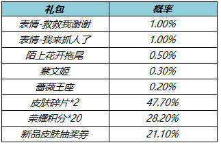表情-“救救我!谢谢”、表情-“我来抓人了”、2个皮肤碎片、20点荣耀积分、1张新品皮肤抽奖券。