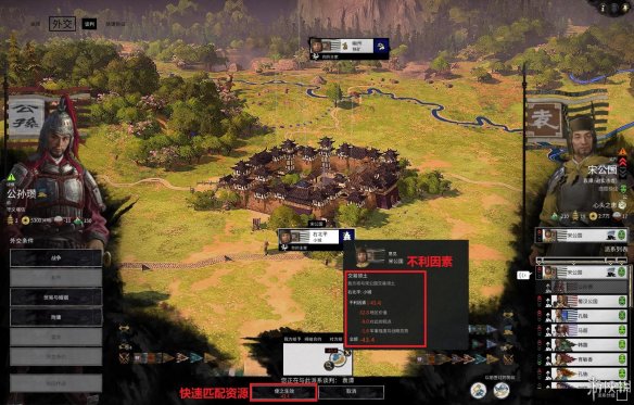提出了需要之后下方会显示不利因素,也就是我们提出要求对对方的价值,我们需要做出等价的交换才能使交易成立,玩家能够点击使之生效来快速进行资源匹配。当然玩家除了交易领土外还能进行诸如联姻、战争和附庸等00事宜来达成自己想要的目的,外交对于整个游戏来说起着至关重要的作用需要妥善处理。