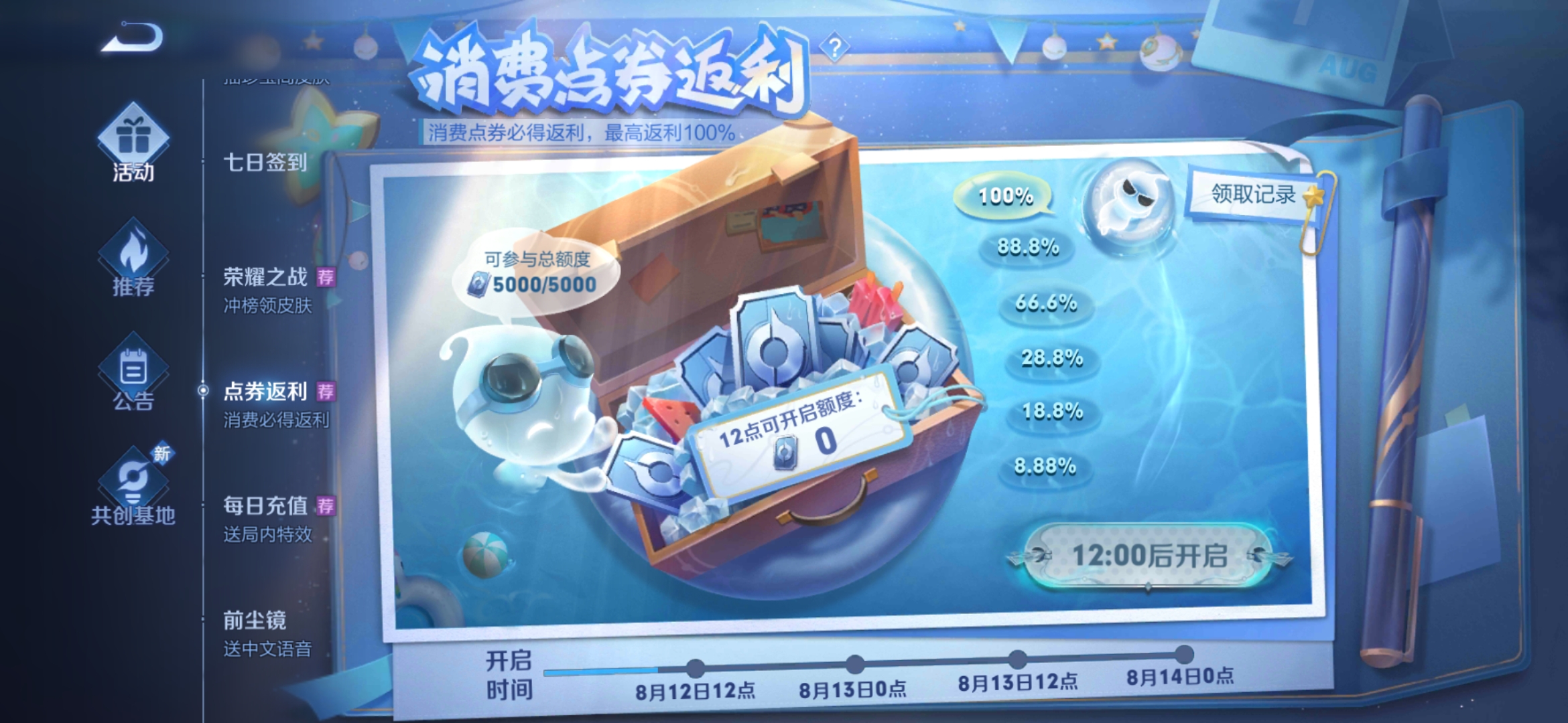 8月12日~8月13日, 玩家每消费1点券可获得1点返利额度,开启返利额度可随机抽取到一定比例的点券返还,最高全额返还。