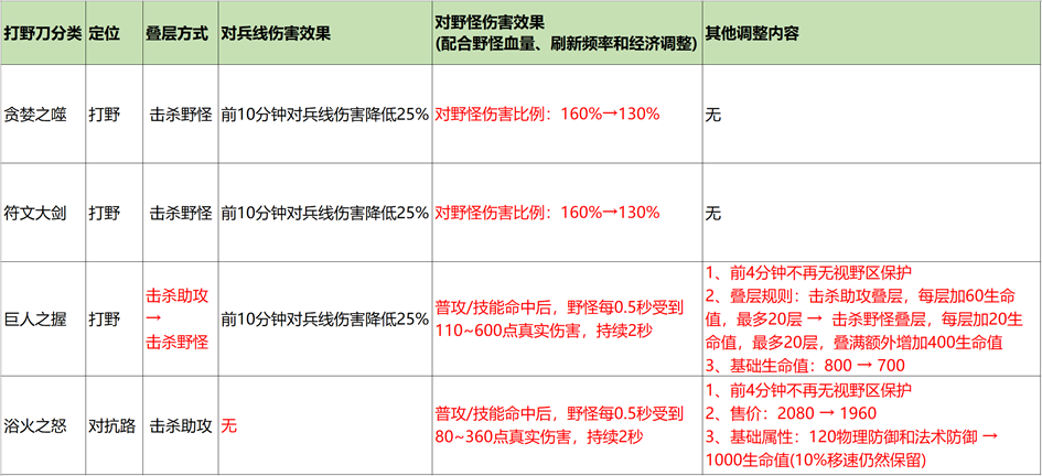 长期以来,我们对于巨人之握和浴火之怒这两把打野刀的定位都不是那么清晰,这也导致了在不同版本中,这两把打野刀经常是上下位的替代关系,对它们的调整也很难同时兼顾打野和边路的玩家,较难平衡。因此这次调整我们希望对于打野刀的功能定位重新做下梳理,将他们的特色定位做下拆分,从而后续的调整在针对某个群体时,可以尽量不影响到其他群体的玩家。