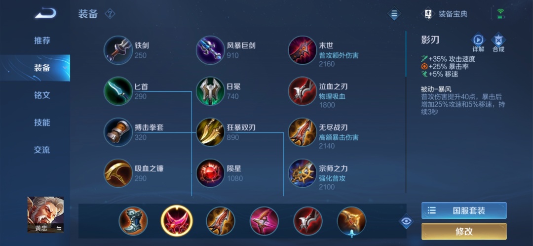 影刃+无尽战刃这两件装备是黄忠这套出装的关键所在,中期可以过渡一个血魂刃, 毕竟后面要合成破晓和逐日之弓,这个经济压力属是有点大,等合成破晓后也可以率先合成泣血之刃,以此来保证黄忠中后期的续航能力~
