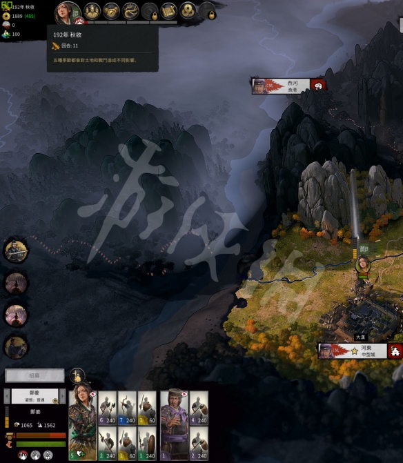 由于连打数战,这时该回家补员了,招几队兵(推荐枪+两队骑兵)休养个两三回合,10回合时往下出兵河东,11回合开始围城,围两回合挖地洞后强攻占领。