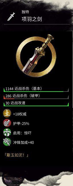 《全面战争:三国》游戏中的董卓的武器是一把金色的大剑,名字叫项羽之剑,属性精良,近战伤害极高。可能是董卓自己收藏的吧,董卓拿着项羽的剑,官方也是考究很深的呀。这里是《全面战争:三国》金色武器董卓项羽之剑属性分享,来自玩家“郁金香之荣耀”的归纳。