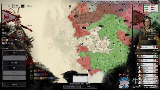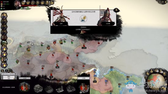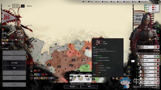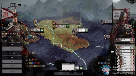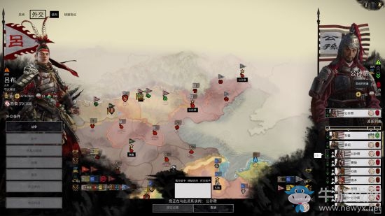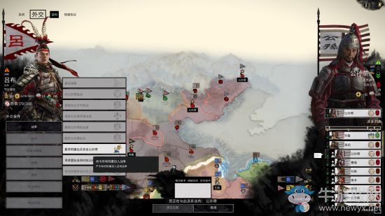 这种情况不但面对源源不断四面八方来的AI军队十分棘手,而且对面诸如公孙瓒、孔融等希望完整的获得他们的武将的势力,打起来也会蹑手蹑脚的(通过吞并附庸可以完整的获得该势力的武将,而消灭势力只会导致他们的武将四散而逃)。这时,就该用到游戏里的一个骚套路了。1.首先,你需要抓一个小势力当附庸,最好是远离敌方。不容易被消灭的。比如这个: