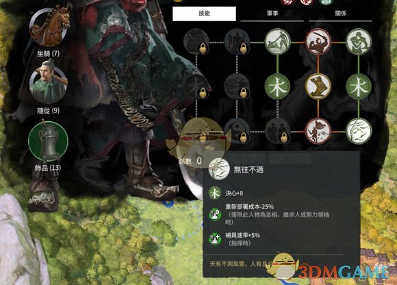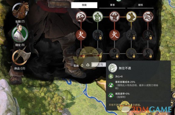 第三步:选择2个土系或火系或木系的武将,点出武将技能里面的无往不适(简体翻译:屈伸),并让他们成为君主和继承人。效果是:减少重新部署费用25%*2
