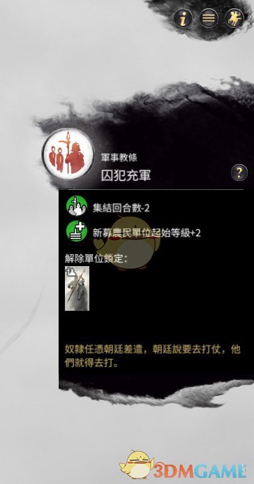劣势1:动员法完全成型需要9个改革科技,还需要占领2个郡,最少需要43回合(个别势力40回合),需要有一定时间积累。