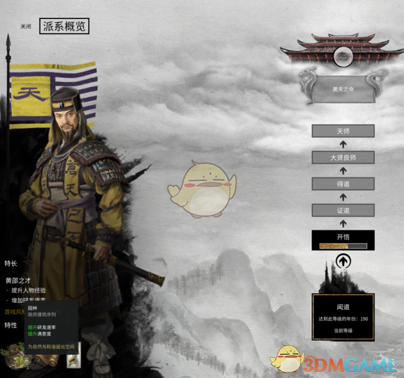 黄巾军的改革画面是六块卷轴,每一项改革下面都有对道德经的阐述,而且黄巾军的声望和道教的大概体系也是一样的,道教是中国唯一的本土教派,讲究天地人自然和谐共处,而道德经又是中国几千年来流传的精华,依据老子道德经,道生一,一生二,二生三,三生万物。