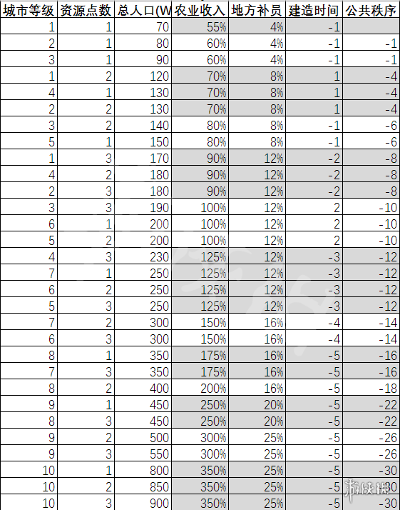 一个郡的主城等级、资源点个数影响人口加成的关系如下: