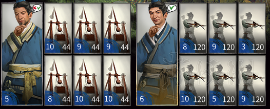陆政(满编中装弩步兵)一般开局启动的时候带2-3队。