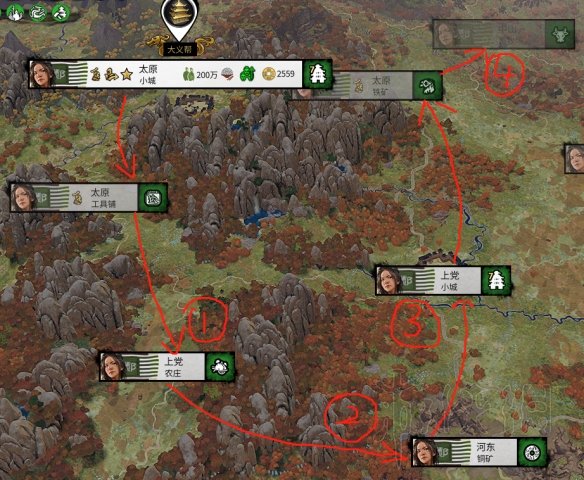 最好前期利用张燕,他是土匪,会一直扩张,前期的小县城,让他对郑姜的开战倾向降低不少,所以我们可以按照图中的思路扩张,在侵略启动的时候,一般打到河东,和他签订互不侵犯(要花不少钱,没钱就卖装备吧)