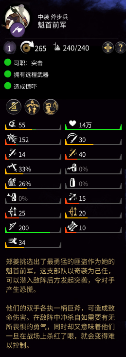 郑姜挑选出了最勇猛的匪盗作为她的魁首前军,这支部队以奇袭为己任,可以潜入敌阵后方发起突袭,令对手产生恐慌。他们的双手各执一柄巨斧,可造成致命伤害。在敌阵中冲杀自如需要有无所畏惧的勇气,同时却又意味着他们一旦在战场上杀红了眼,就会变得难以控制。