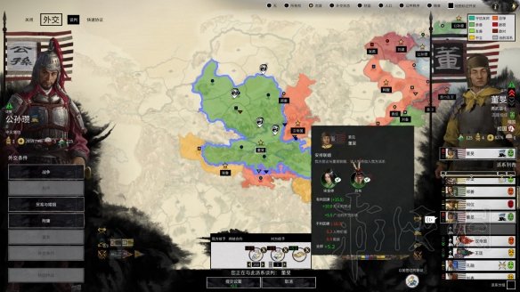 除董卓任何势力开局,大家先按自己的思路攻城掠地,等触发董卓已死董旻继任的剧情,直接与董旻谈合并附庸,开启全图外交,接下来开始表演。